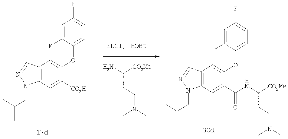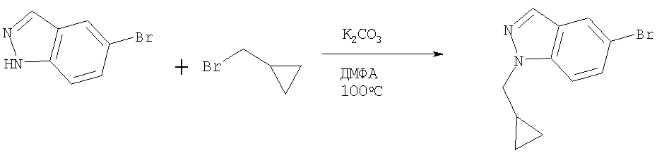 Стадия С: 5-Фтор-2-(1-изобутил-1Н-индазол-5-илокси)бензонитрил. К раствору 1-изобутил-1Н-индазол-5-ола (2,33 г, 12,2 ммоль) и К2СО3 (2,03 г, 14,7 ммоль) в ДМФА (75 мл) добавляли 2,5-дифторбензонитрил (1,87 г, 13,5 ммоль). Смесь нагревали до 110°С в течение 18 часов в атмосфере N2. Реакционную смесь концентрировали при пониженном давлении и остаток растворяли в дихлорметане. Раствор промывали 1 н. HCl, фильтровали и концентрировали при пониженном давлении. Остаток подвергали хроматографии на Biotage, элюируя смесью гексаны/эфир (5:2) и получая 3,05 г бледно-желтого масла (выход 81%).