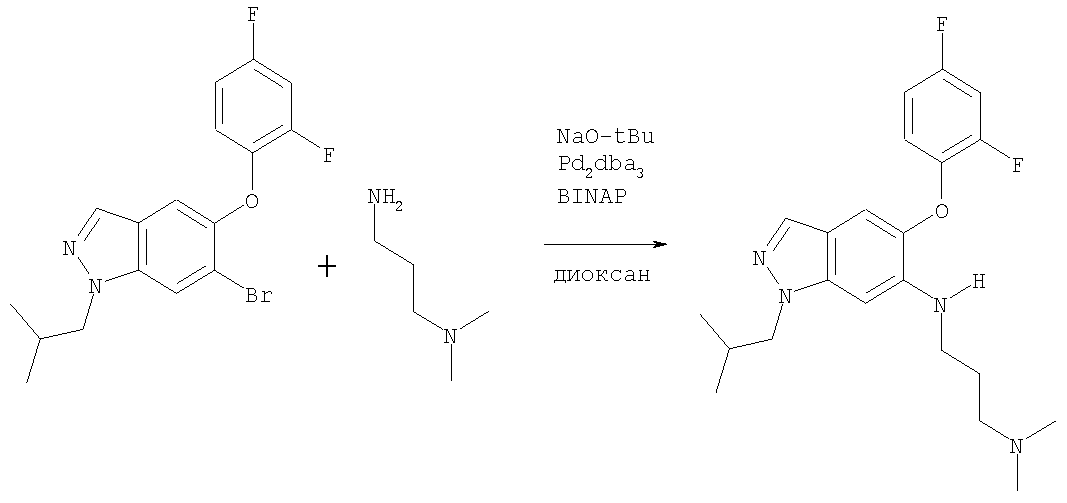 Стадия В: {2-[5-(2-Аминометил-4-фторфенокси)индазол-1-ил]этил}диметиламин. К охлажденному (0°С) раствору 2-[1-(2-диметиламиноэтил)-1Н-индазол-5-илокси]-5-фторбензонитрила (0,115 г, 0,303 ммоль) в ТГФ (3 мл) добавляли LAH (0,61 мл 1 М раствора в ТГФ). Смесь нагревали до комнатной температуры и перемешивали в течение 1,5 часов. Смесь гасили водой (23 мкл), 3 н. NaOH (23 мкл) и водой (69 мкл). Соли удаляли фильтрацией, и фильтрат концентрировали при пониженном давлении, получая 0,113 г продукта (выход 97%).