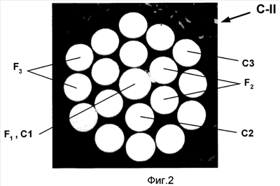Так, например, внутренний слой С1 тросов согласно изобретению может быть образован из проволоки с некруглым сечением, которая может быть пластично деформируемой, в частности из проволоки с по существу овальным или многоугольным сечением, например с треугольным, квадратным или, как вариант, с прямоугольным сечением; слой С1 также может быть выполнен из предварительно сформированной проволоки, независимо от того, имеет ли она круглое сечение, например, из волнистой или буравчатообразной проволоки, или из скрученной в форме спирали либо зигзагообразной проволоки. В таком случае, безусловно, следует иметь в виду, что диаметр d1 слоя С1 представляет собой диаметр воображаемого цилиндра вращения, который окружает центральную проволоку (диаметр основной части), а не диаметр (или иной поперечный размер, если ее сечение некруглое) самой центральной проволоки. То же самое применимо в том случае, если слой С1 образован не из одной проволоки, как в предыдущих примерах, а из нескольких проволок, собранных совместно друг с другом, например из двух проволок, расположенных параллельно друг другу или, как вариант, скрученных друг с другом, причем в направлении кручения, идентичном или не идентичном направлению кручения для промежуточного слоя С2.