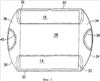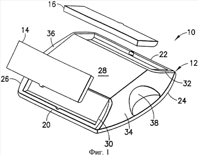 Корпус 12 отлит унитарно из термопластичного материала и имеет, в общем, удлиненную нижнюю поверхность 18 с параллельными передним и задним краями 20 и 22 и первым и вторым дугообразными боковыми краями 24 и 26 соответственно, которые проходят между передним и задним краями 20 и 22. Боковые края 24 и 26 являются выпуклыми и, в общем, эллиптической конфигурации. Корпус 12 дополнительно имеет верхнюю поверхность 28, расположенную против нижней поверхности 18. Верхняя поверхность 28 является, в общем, прямоугольной, в общем, планарной и приблизительно параллельной нижней поверхности 18. Однако для верхней поверхности могут быть предусмотрены другие конфигурации, например цилиндрическая или некоторая другая выпуклая дугообразная конфигурация. Верхняя поверхность 28 ограничивает площадь, существенно меньшую, чем нижняя поверхность, а предпочтительно составляющую менее половины площади нижней поверхности 18. Передняя и задняя поверхности 30 и 32 проходят соответственно от переднего и заднего краев 20 и 22 нижней поверхности 18 к верхней поверхности 28 и сходятся в направлении друг к другу. Первая и вторая дугообразные боковые поверхности 34 и 36 проходят соответственно от первого и второго боковых краев 24 и 26 нижней поверхности 18 к верхней поверхности 28. Пересечения верхней поверхности 28 и первой и второй боковых поверхностей 34 и 36 представляют собой плавные дуги. Первая и вторая боковые поверхности 34 и 36 отличаются вогнутыми углублениями 38 и 40 соответственно. Углубления 38 и 40 ограничивают удобные для захвата пальцами области, а также помогают достичь однородной толщины стенки для всех областей корпуса 12 для получения эффективностей отливки, как объясняется в этой заявке.
