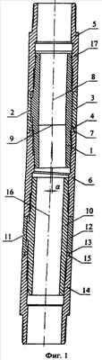 Кривой переводник 6 соединен на резьбе с промежуточным валом 10, имеющим наружные шлицы 11, на которых установлена обойма 12 с торцовой насечкой 13. На нижнем конце промежуточного вала 10 установлен соединительный переводник 14 с торцовой насечкой 15, взаимодействующей с торцовой насечкой 13 обоймы 12. Центральная ось 16 и ось искривленного участка кривого переводника 6 также пересекаются в точке 9 под углом . Кроме того, оси промежуточного вала 10, обоймы 12, соединительного переводника 14 совмещены и расположены по центральной оси 16 кривого переводника 6. Для герметизации резьбовых соединений на концах кривого и промежуточного валов в канавках размещены уплотнительные кольца 17.
