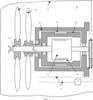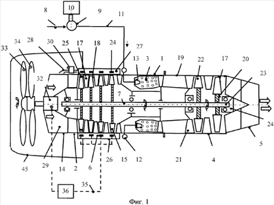 При останове винтовентиляторного авиационного двигателя все операции осуществляются в обратной последовательности. Так как роторы биротативного электродвигателя 32 имеют рабочие обороты, в несколько раз меньшие, чем вал 7 турбокомпрессора 1, то отпадает необходимость в применении тяжелого и дорогостоящего редуктора, который применяется, например, на двигателе НК 12 MB. Воздушные винтовентиляторы 33 и 34 вращаются в противоположные стороны с одинаковыми частотами вращения.