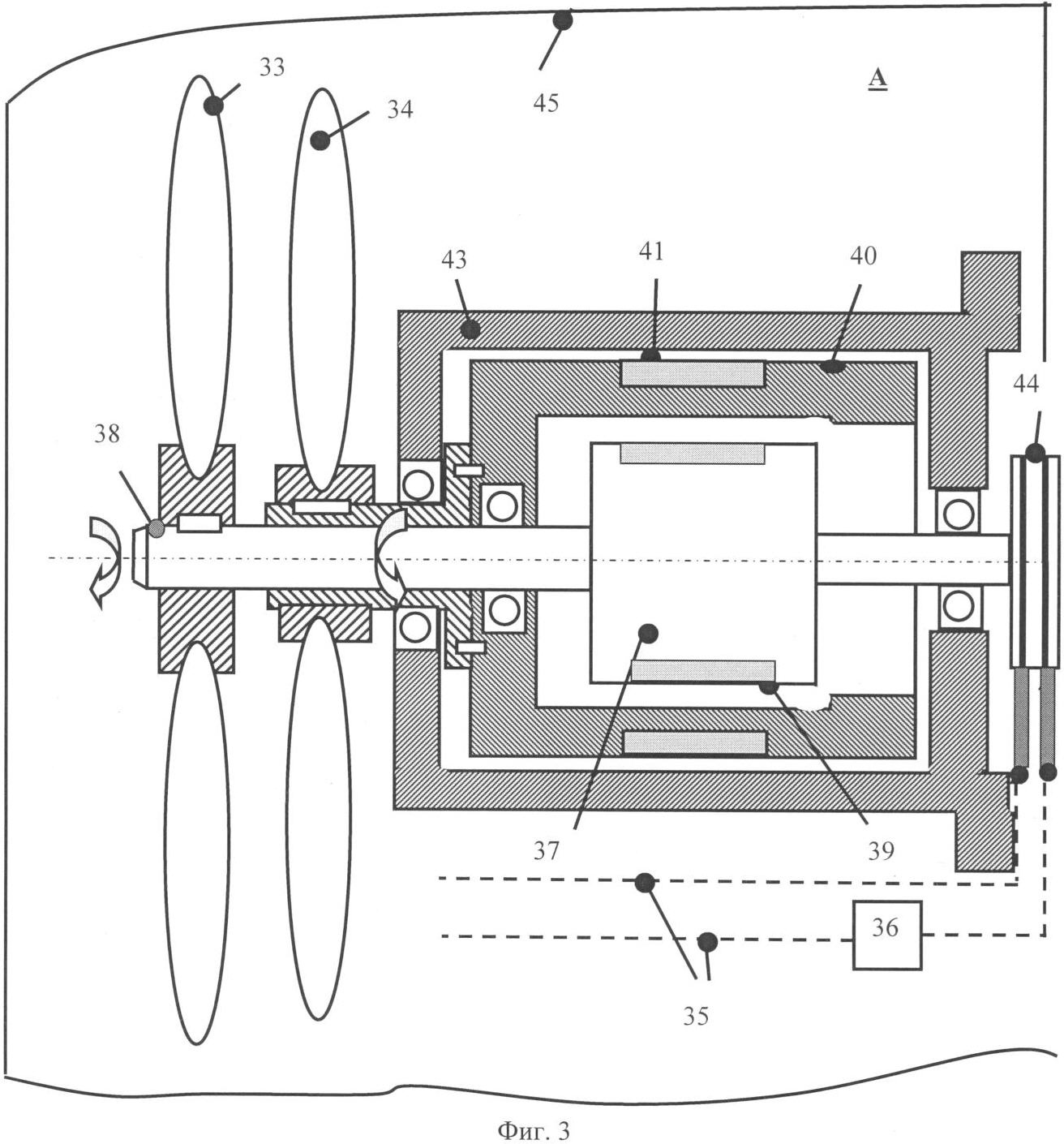 Биротативный электродвигатель 32 (фиг.3) содержит внутренний ротор 37 с внутренним валом 38 и постоянными магнитами 39, внешний ротор 40 с внешним валом 41, с обмотками 42 и статор 43. Для подвода электроэнергии служит коллектор 44.