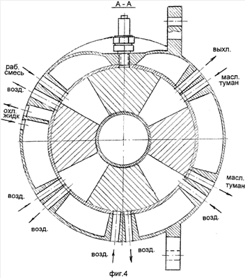 Предлагаемый двигатель состоит из двух колец с закрепленными на каждом из них по два поршня. Каждый поршень представляет собой призму, в сечении которой – 60-градусный кольцевой сектор. Поршни расположены на кольце диаметрально. При сборке поршни одного кольца входят в пространство между поршнями другого. При этом каждое из колец может поворачиваться относительно другого на угол 60 градусов. Вместе оба диска установлены в цилиндрической оболочке и на одном полом валу. При повороте одного из них относительно другого в двух камерах между поршнями происходит расширение, в двух других – сжатие. В одной (или двух – в зависимости от возможностей теплоотвода) из сжимаемых камер впрыснутая в предыдущем цикле рабочая смесь воспламеняется. Происходит рабочий ход. Остальные циклы достаточно полно указаны на фиг.1 для двигателя с одной рабочей камерой и на фиг.2 для двигателя с двумя камерами.