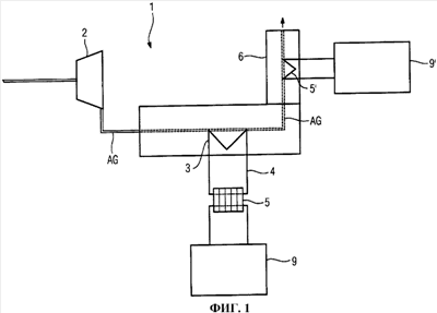 Цикл Калины 9 при этом может быть выполнен в качестве стандартизованного решения, которое рассчитано на заранее определенную температуру в теплообменнике 5. Согласование цикла Калины 9 с температурой отходящих газов AG происходит через цикл горячей воды 4. За счет выбора параметров цикла горячей воды и/или его режима работы, например через его давление и объемный поток воды, устанавливают желаемую заранее определенную температуру на теплообменнике 5.