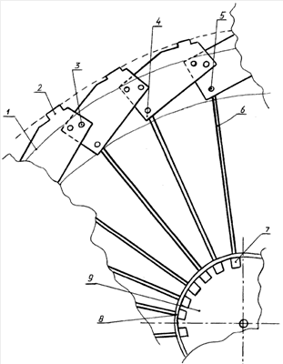 Работа устройства. При наличии ветрового потока, который оказывает давление на спицы (лопасти 6), ротор приходит во вращение. Ферромагнитные магнитопроводы (фактически зубцы 2 ротора) модулируют магнитный поток статора. Статор установлен на нижнем конце траверзы, которая прикреплена к подвижному (поворотному) основанию, на котором также укреплены подшипник ступицы 9 и хвост ветроэлектрогенератора. Основание с траверзой – известные элементы, на чертеже не показаны. Статор, как и все статоры индукторных генераторов, представляет собой магнитную цепь, в состав которой, кроме магнитопровода, входит источник магнитного поля – постоянный магнит или катушка возбуждения, и рабочая катушка, которая воспринимает изменения потока, вызванные модуляцией его ротором. Индуцированное напряжение далее подается на блок регулирования и затем к нагрузке.