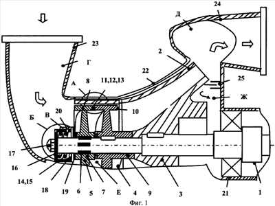 Вал 1 установлен в основном подшипнике 21 (фиг.1), который, в свою очередь установлен в корпусе 22. К корпусу 22 подстыкован входной корпус 23 с входной полостью «Г» и выходной корпус 24 с выходной полостью «Д», между шнеками 4 и 5 выполнена полость «Е». На заднем торце ступицы 3 крыльчатки 2 выполнено заднее уплотнение 25, отделяющее выходную полость «Д» от разгрузочной полости «Ж». Разгрузочная полость «Ж» позволяет уменьшить осевое усилие на основной подшипник 21.