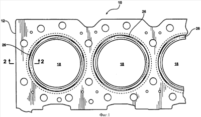 Многослойная металлическая прокладка, разработанная в соответствии с первым предпочтительным вариантом выполнения настоящего изобретения, обозначена на фиг.1 и 2 позицией 10 и содержит набор, по меньшей мере, первого и второго слоев 12, 14 и частично стопорный слой 16 между слоями 12, 14. Слои 12, 14 изготовлены из эластичного листового металла, такого как нержавеющая сталь или подобный материал, и имеют отверстия различной формы, в том числе, по крайней мере, одно, а чаще несколько отверстий 18 для цилиндров 20 двигателя, расположенных в блоке 22 двигателя, который в некоторых двигателях может содержать вкладыш 24 цилиндра, показанный на фиг.2. Отверстия 18 цилиндра и отверстия слоев 12, 14 прокладки совмещены, и каждый слой 12, 14 прокладки имеет соответствующий эластичный уплотняющий выступ 26, 28, окружающий по кругу отверстие 18. Уплотняющие выступы 26, 28 получены посредством деформации первого и второго слоев 12, 14 и представляют собой валик материала слоя прокладки, предпочтительно, в форме полного выступа, который выдается над плоскостью оснований 30, 32 соответствующих слоев 12, 14 прокладки. Уплотняющие выступы 26, 28 первого и второго слоев 12, 14 прокладки совмещены и направлены друг к другу, как показано в варианте выполнения изобретения по фиг.2. Уплотняющие выступы 26, 28 расположены в радиальном направлении наружу от отверстия 18 цилиндра, при этом образуются внутренние участки 34, 36, окружающие отверстие 18 и отделяющие уплотняющие выступы 26, 28 от отверстия 18. Участки 34, 36 являются частью оснований 30, 32 слоев 12, 14 прокладки, имеют, предпочтительно, плоскую поверхность и параллельны друг другу. На противоположных в радиальном направлении внешних сторонах уплотняющих выступов 26, 28 выполнены внешние участки 38, 40, которые являются частью оснований 30, 32 и имеют плоскую поверхность, предпочтительно, параллельны, а еще более предпочтительно, лежат в той же плоскости, что и внутренние участки 34, 36 соответственно, при этом на внешнюю поверхность слоев 12, 14 прокладки может быть нанесено прорезиненное покрытие 42.