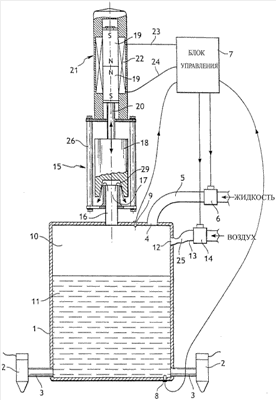 Резервуар известным образом снабжен отверстием 12 для подачи газа, соединенным с трубопроводом 13 подвода сжатого воздуха, оборудованным управляемым расширителем 14 проходного сечения, подключенным к блоку 7 управления.
