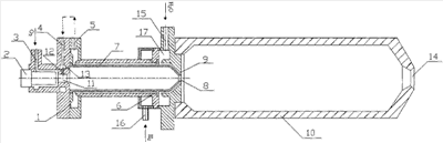 Окислитель (О2) из магистрали 3 поступает к торцевой части электрической запальной свечи 2, где инициируется электрическим разрядом на свече 2, и далее поступает в подсвечной канал 11. Горючее (Н2) из магистрали 16 попадает в коллектор 17, а из него через отверстия 6 – в тракт 7 охлаждения цилиндрической части камеры сгорания, охлаждает ее и через магистрали 5 и 4 подается в смесительную головку 1. Меньшая часть горючего через отверстия 12 подается в подсвечной канал 11, где воспламеняется с инициированным окислителем, образуя окислительный запальный факел, который истекает в камеру сгорания. Большая часть горючего через форсунки 13 подается в камеру сгорания, где перемешивается с окислительным запальным факелом и сгорает при стехиометрическом соотношении. Образующийся высокотемпературный водяной пар истекает из промежуточного сопла 8 в камеру смешения 10, Сюда же через магистраль 15, коллектор 17 и тракт 9 охлаждения промежуточного сопла 8 подается балластировочная вода (Н2О) при комнатной температуре (300 К, т.е. 27°С), которая перемешивается с высокотемпературным водяным паром, образуя рабочее тело (водяной пар) заданного уровня температуры.