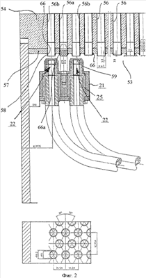 39. Головка по п.38, отличающаяся тем, что трубы (56) теплообменника расположены с равномерным шагом, при этом расположение струйных сопел (22) в держателе (21) соответствует шагу труб (56) теплообменника.