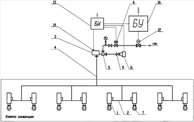 Управление процессом автоматической газоимпульсной очистки осуществляется посредством комплекса управления, состоящего из электромагнитного клапана газа 6, вентилятора 11, электроприводной задвижки газовой 12, запальника 14, блока исполнительного 15, блока управления 16.