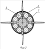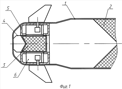 На фиг.1, 2 изображена схема предлагаемого устройства управляемого снаряда. В корпусе снаряда 1 скомпонованы основная кумулятивная БЧ – 2 и ЛКЗ – 3 в своем корпусе 4. Концентрично ЛКЗ размещена обойма с цилиндрическим корпусом, выполненным по форме полого цилиндра 5 с центральным отверстием под ЛКЗ. В обойме равномерно распределены поражающие элементы 6, например, в виде имеющих достаточную массу металлических тел. Стенки цилиндрического корпуса обоймы спрофилированы с целью получения набора однородных осколков и обеспечения радиального их разлета при срабатывании ЛКЗ. Для этого по цилиндрическим образующим стенок цилиндрического корпуса обоймы выполнены ослабления на внутренней стенке, например, в виде продольных пазов 7, а на внешней – в виде продольных расточек 8. При этом цилиндрический корпус обоймы одновременно несет функции корпуса БРП, а поражающие элементы полностью или частично выполнены из составных частей БРП, т.е. элементы конструкции БРП несут дополнительную функцию источника поражающих элементов и осколков при срабатывании ЛКЗ и основной БЧ. Данное техническое решение особенно рационально при применении БРП, содержащего рулевые приводы электромагнитного типа, выполненные, например, на втяжных электромагнитах. В этом случае поражающие элементы из составных частей БРП получаются почти автоматически из симметричного набора массивных электромагнитов, установленных с возможностью радиального разлета при срабатывании ЛКЗ, а потом и основной БЧ. Для обеспечения сохранности воронки основной БЧ от действия взрывной волны ЛКЗ последний размещают от основной БЧ на расстоянии, превышающем путь взрывной волны ЛКЗ за время задержки. В обойме могут быть размещены специальные поражающие элементы, функционально не связанные с устройством БРП.