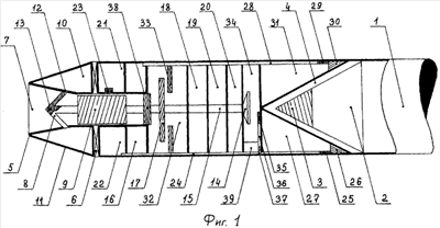Защитный модуль для баллистических, крылатых и тактических ракет против обнаружения их радиолокационными станциями или системами “ПРО”, фиг.1, содержит корпус 1, в котором размещена баллистическая, крылатая или тактическая ракета 2, имеющая боеголовку 3. Защитный промежуток 4 защищает боеголовку 2 от контакта с работающими устройствами защитного модуля 1. Вращающаяся головная часть 5 опирается на элементы качения или скольжения 6 и содержит входное сопло 7, центральное разветвление 8, газовую турбину 9, носовые камеры давления 10, которые имеют множество перфорационных отверстий 11. Внутри центрального разветвления 8 расположены каналы разветвления 12, которые связаны с носовой камерой давления 10, и проводящие каналы 13, которые связаны с конической насадкой 14. Проводящие каналы 13 расположены в трубопроводе 15, который жестко связан с роторным двигателем Белашова 16, дезинтегратором 17, кавитационным устройством Белашова 18, сепарирующим устройством 19 и ионизирующим устройством Белашова 20. К роторному двигателю Белашова 16 примыкает парогенератор 21 и нагреватель 22. Парогенератор 21 содержит пропускное дозирующее устройство 23, которое связано с входным соплом 7, где расположена турбина 9. Нагреватель 22 через трубопровод 24, устройство дозированной подачи жидких компонентов 25, водяной компрессор 26 связан с емкостью для воды или водной смеси 27. Роторный двигатель Белашова 16 через трубопровод 28, устройство дозированной подачи горючих компонентов 29, топливный компрессор 30 связан с топливной емкостью 31. Дезинтегратор 17 расположен в смесительной камере 32, имеющей неподвижные билы 33. Ионизированные воздушные компоненты выходной камеры 34, находящиеся под давлением, через систему торцевого разветвления, выполненную в виде пропускных дозирующих устройств 35, трубопроводов 36, выходят из устройств подачи воздушных компонентов 37. Ионизированные воздушные компоненты из выходной камеры 34, через трубопровод 15, проводящие каналы 13 поступают в носовые камеры давления 10 и под давлением выходят через множество перфорационных отверстий 11. Смесительное устройство 32 содержит систему клапанов 38, которые связаны с входным соплом 7 и газовой турбиной 9. Интеллектуальное устройство 39, фиг.2, содержит электронно-вычислительную машину 40, которая связана с