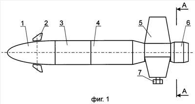 Управляемый снаряд [1] состоит из головного отсека 1, руля в одной плоскости 2, рулевого отсека 3, боевой части 4, двигательной установки 5, стабилизатора 6, крыльев 7. Недостатком такой конструкции является то, что расположение рулей в одной плоскости создает несимметрию аэродинамических характеристик по каналам управления. Для симметрии (осреднения по каналам) аэродинамических характеристик необходимо задавать большую (20 25 об/с) угловую скорость вращения по крену снаряда.