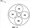 Фиг.12 показывает вид в плане приведенной в качестве примера конфигурации 132 датчика 64, используемой для измерения зазора между стационарной и вращающейся компонентами в паровой турбине по фиг.1 и 4. В иллюстрируемом варианте осуществления датчик 132 содержит множество наконечников 134, 136, 138 и 140 емкостного зонда, которые могут содержать, например, электропроводные валы. Иллюстрируемые геометрия и относительные положения зондов 134, 136, 138 и 140 облегчают измерение большого диапазона осевого смещения, например, превышающего 0,5 дюймов, в то же время обеспечивая требуемую разрешающую способность для радиальных измерений, например для измерения смещений порядка 0,01 дюйма. Вышеупомянутый параметр является предпочтительным в приложениях, где осевые смещения вращающейся компоненты 14 существенно превышают радиальные смещения относительно кожуха 16.