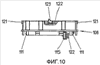 Когда устройство находится в смонтированном состоянии, нижняя сторона 116 устройства ввода и вывода обращена к источнику питания. На ней имеется четыре расположенных по кругу сектора 118, в каждом из которых сгруппировано несколько контактных поверхностей 119. Каждая группа контактных поверхностей 119 имеет форму сектора кольца. Эти контактные поверхности соединены с управляющими клавишами 105, 106 или с устройством 103 отображения посредством непоказанного провода. Они служат для установления контакта со вторым средством 123 обеспечения контакта, имеющегося на электронном устройстве, которое более подробно объяснено на Фиг.10. В варианте осуществления изобретения согласно Фиг.8 имеется четыре группы средств обеспечения контакта, а следовательно, четыре контактных поверхности 119, которые позволяют монтировать устройство 100 ввода и вывода в четырех различных положениях на источнике питания и устанавливать контакт в каждом выбранном положении со вторым средством 123 обеспечения контакта источника питания.