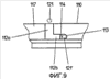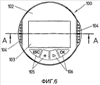На виде сверху устройства 100 ввода и вывода, приведенном на Фиг.6, хорошо видна верхняя сторона 102 устройства 1 ввода и вывода, на которой имеется средство 103 отображения и управляющие клавиши 105, 106. Устройство 100 ввода и вывода имеет практически цилиндрический корпус, который имеет две ручки 104 в виде углублений. Ручки 104 в виде углублений расположены напротив друг друга и служат для упрощения манипулирования с устройством 100 ввода и вывода, в частности для его поворота.