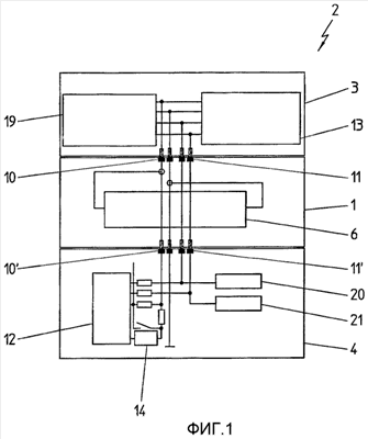 Кроме того, на Фиг.1 показано, что контроллер 13 блока 3 отображения и регулирования соединен с блоком 4 маломощного датчика посредством второго средства 20′ обеспечения контакта блока 3 отображения и регулирования, второго средства 11 обеспечения контакта источника 1 питания и второго средства 11′ обеспечения контакта, а также посредством второго средства 21′ обеспечения контакта блока 4 маломощного датчика.