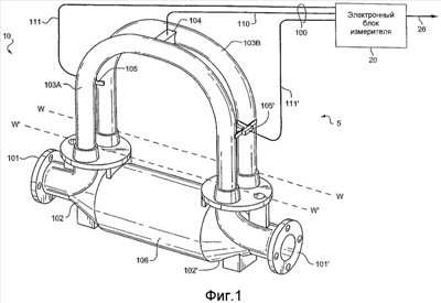 Электронный блок 20 измерителя принимает сигналы датчиков по проводникам 111 и 111′ соответственно. Электронный блок измерителя 20 вырабатывает сигнал возбуждения в проводнике 110, который заставляет возбудитель 104 раскачивать измерительные трубки 103A и 103B. Электронный блок 20 измерителя обрабатывает левый и правый сигналы скорости от датчиков 105 и 105′ для вычисления массового расхода. Путь 26 обеспечивает средство ввода и вывода, которое позволяет электронному блоку 20 измерителя взаимодействовать с оператором. Описание фиг.1 представляет всего лишь пример работы кориолисова расходомера и не призвано ограничивать принципы настоящего изобретения.
