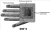 На фиг.9 показан еще один вариант реализации тактильного датчика в форме пальца. Каждый кончик пальца из пяти пальцев снабжен тактильной частью, содержащей прозрачный гибкий корпус с маркерами и фотографирующее устройство, например камеру. Тактильный датчик в форме пальца содержит локальный процессор и центральный процессор (не показан). Локальный процессор расположен на ближней стороне и на части, соответствующей обратной стороне руки или ладони. Неограничивающим примером локального процессора является устройство на основе вентильной матрицы с эксплуатационным программированием. Центральный процессор расположен на удаленной стороне. Каждая камера, установленная на кончиках пальцев, имеет электрическое соединение с локальным процессором, так что данные, полученные от каждой камеры, передаются к локальному процессору, где вычисляется информация, касающаяся перемещений маркеров на основе полученной видеоинформации о маркерах. Локальный процессор электрически связан с центральным процессором так, что информация, касающаяся перемещений маркеров, передается к центральному процессору, где вычисляется распределение вектора силы на основе информации, касающейся перемещений маркеров. Так как информация в виде изображения содержит большое количество информационных величин, трудно передать видеоинформацию через стандарт передачи данных, такой как USB и IEEE1394, с требуемой скоростью. Как показано на фиг.9, информация, которая требуется для восстановления распределения вектора силы (информация, касающаяся перемещений маркеров, например), выделяется локальным процессором, расположенным около камеры, и только выделенная информация, количество которой значительно уменьшено по сравнению с исходными данными изображения, передается к центральному процессору.