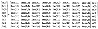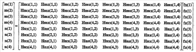 Когда уравнение представляется в матричной форме, X=H×f, где H=[Mx(1); Mx(2); ; Mz(4)], H называется передаточной функцией, потому что H представляет собой отображение, которое преобразует силу f в деформацию x. Форма матрицы, записанной с элементами, является следующей: