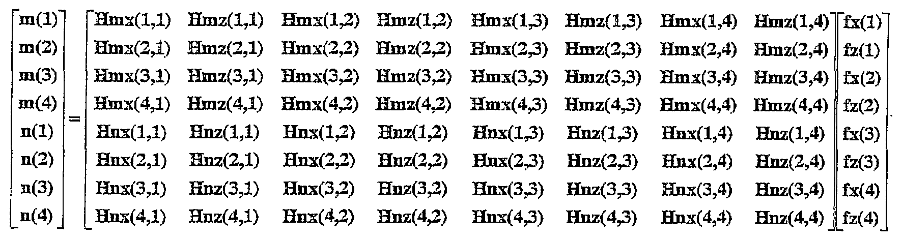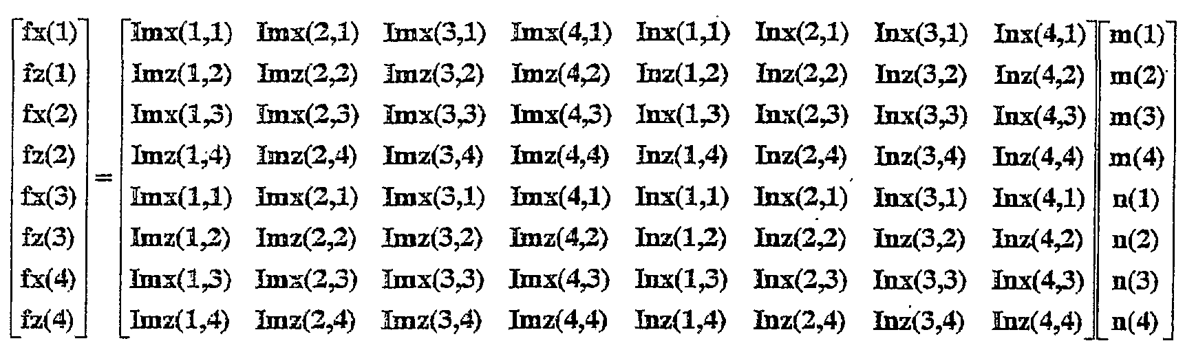 Восемь компонент f=[fx(1), fx(2), fx(3), fx(4), fz(1), fz(2), fz(3), fz(4)] представляют собой распределение полученных векторов сил, где m=[m(1), m(2), m(3), m(4)] и n=[n(1), n(2), n(3), n(4)] являются векторами перемещения, которые измеряются. Векторы m и n представлены как Х. А именно X=[m(1), m(2), m(3), m(4), n(1), n(2), n(3), n(4)]. Векторы перемещения m и n наблюдаются, когда единичная сила (величина равна 1) в направлении x прикладывается в точке 1, они представлены как Mx(1).