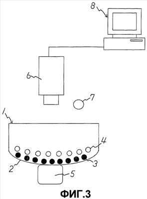 Когда объект 5 контактирует с прозрачным гибким корпусом 1, окрашенные маркеры 3, 4, расположенные внутри прозрачного гибкого корпуса 1, смещаются благодаря внутренней деформации гибкого корпуса. Датчик также снабжен камерой 6 в качестве фотографирующего устройства и источником света 7. Оптическая камера 6 расположена на стороне, противоположной стороне контакта с объектом 5, поэтому прозрачный гибкий корпус 1 расположен между оптической камерой 6 и объектом 5, и поведение или перемещение маркеров 3, 4 фотографируется камерой 6. Источник света 7 может передавать световое излучение по волноводу, например по оптическому волокну. Изображения маркеров 3, 4, полученные с помощью камеры 6 как средства формирования изображения, передаются на компьютер 8 устройства для восстановления распределения вектора силы. Устройство для восстановления распределения вектора силы содержит процессор, устройство памяти, устройство дисплея, входное устройство, выходное устройство и другие устройства, которые обычно установлены в универсальном компьютере. Процессор вычисляет информацию о маркере (векторы перемещения), касающуюся перемещения или движения маркера на изображении. Кроме того, процессор восстанавливает распределение сил, приложенных к поверхности 2 со стороны объекта 5, используя информацию о маркере (информацию о перемещении) и передаточную функцию, которая сохраняется в устройстве памяти.