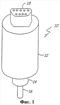 Фиг.1 и 2 – это схематичные представления датчиков вакуума высокой степени чистоты, с которыми варианты осуществления настоящего изобретения особенно применимы. Датчик 10, в общем, включает в себя корпус 12 электронной части чувствительного элемента, узел 14 чувствительного элемента, технологическое соединение 16 и электрический соединитель 18. Технологическое соединение 16, в общем, соединено с источником вакуума или давления в среде высокой степени чистоты и соединяет источник с узлом 14 чувствительного элемента посредством текучей среды. Чувствительный к давлению элемент в модуле 14 имеет электрическую характеристику, которая варьируется в зависимости от давления. Примеры таких чувствительных к давлению элементов включают в себя, без ограничения, основанные на изменчивом мембранном емкостном сопротивлении чувствительные элементы и основанные на изменчивой мембранной деформации чувствительные элементы. Электронная часть в корпусе 12 электронной части чувствительного элемента электрически соединяется с узлом 14 чувствительного элемента так, чтобы можно было измерить изменение электрической характеристики. Дополнительная электронная часть в корпусе 12 может выполнять дополнительные функции, такие как преобразование электрического сигнала в цифровое представление, а также линеаризацию и/или получение характеристик цифрового выхода. Дополнительно, электрический выход может быть сконфигурирован для передачи на основе любого подходящего стандартного промышленного технологического протокола связи, такого как протокол HART® или FOUNDATIONТМ Fieldbus. Система управления технологическими процессами и дополнительные связанные с технологическими процессами устройства могут быть подсоединены к электрическому соединителю 18.