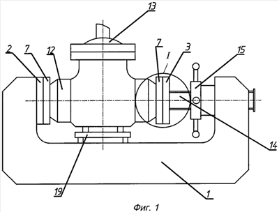 Во внутренний диаметр патрубка 12 испытываемого изделия 13, вне приспособления, устанавливают заглушки 7, с помощью винтов 10 поджимом 9 производят предварительную деформацию эластичного кольца 11 таким образом, чтобы кольцо 11 по всей окружности соприкасалось с внутренней поверхностью патрубка 12. Затем изделие 13 в сборе с заглушками 7 помещают на опору 19 предварительно выставив ее таким образом, чтобы ось посадочного выступа 6 совпадала с осью выемки 5 планшайб 2 и 3. После чего, управляя подвижной планшайбой 3, производят зажим изделия 13 посредством винта 14 и гайки 15 или щеки 16, проставок 17 и клинового зажима 18. Затем через каналы 4 и 8 подают испытательную среду, предварительно удалив воздух из испытываемого изделия, если это трубопроводная арматура, то, как правило, через сальниковое уплотнение, если это изделие типа труба, то по каналу 4 неподвижной планшайбы 3 давлением согласно технической документации. Но т.к. кольцо 11 уже сдеформировано до соприкосновения с патрубком 12 по всему периметру, то происходит надежная герметизация патрубка, исключающая какие-либо протечки испытательной среды. После чего производится осмотр и ревизия изделия.