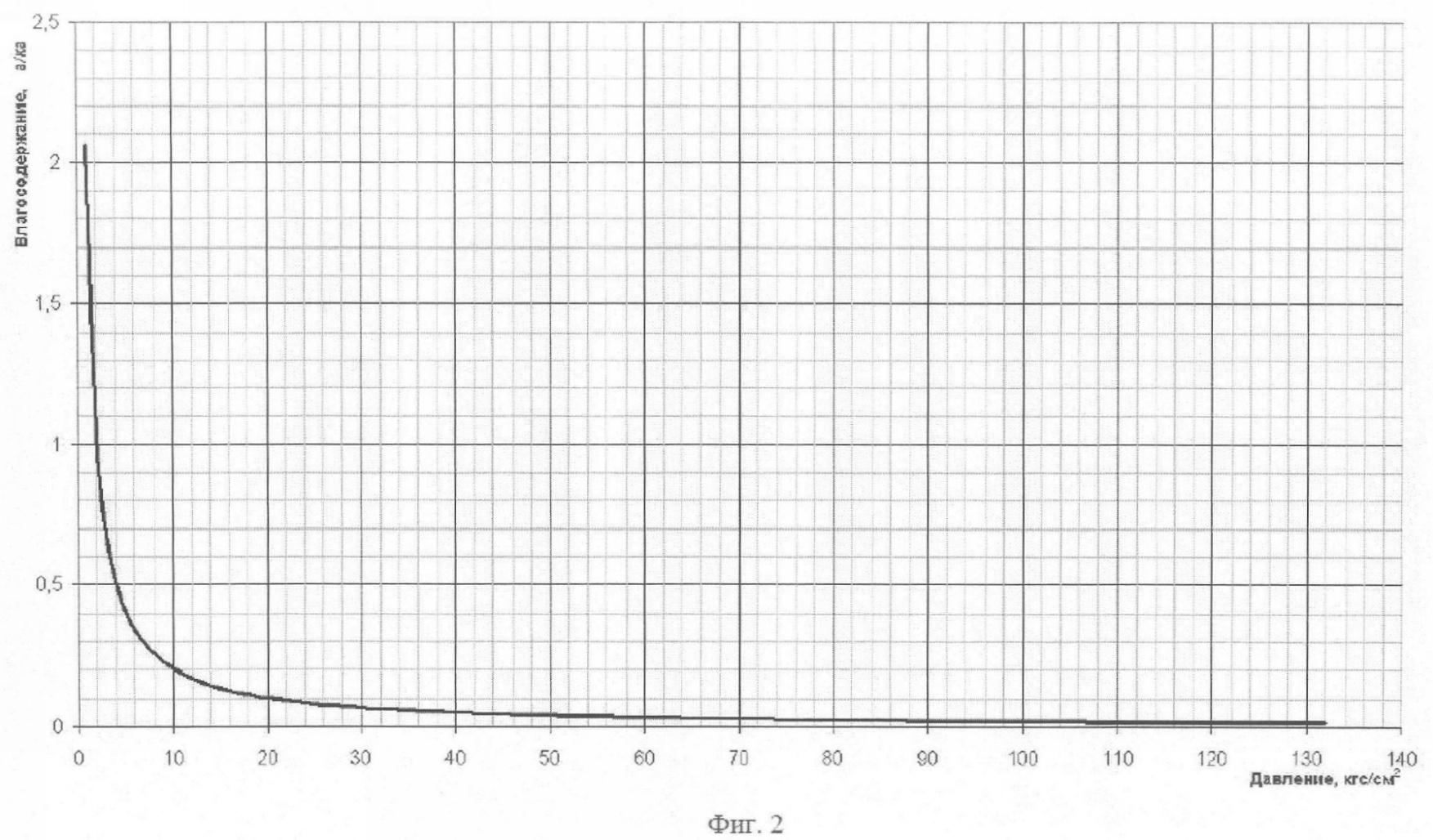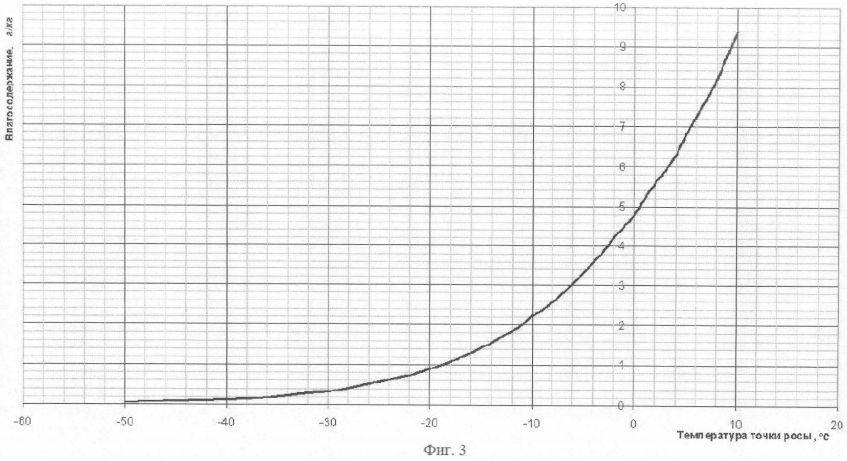 Сначала при помощи средства 6 измеряют температуру окружающей участок среды. В примере на фиг.1 это температура грунта. По измеренной температуре определяют влагосодержание воздуха в участке 3 при испытательном давлении (см., например, фиг.2). Затем открывают краны 14, 15, 16 и закрывают краны 17, 18, 19, 20, 21, 22. Запускают компрессор 1 и, контролируя давление штатным средством измерения или средством 13 на выходе 5, устанавливают и удерживают на выходе 5 при помощи регулятора 8 максимально допустимое по техническим условиям оборудования МКУ давление (нагнетания). При этом сжатый воздух компрессором 1 через АВО 10, кран 14, влагоотделитель 4, его выход 5, регулятор 8, дополнительный влагоотделитель 9, краны 15 и 16 направляется в атмосферу. Спустя время, необходимое для стабилизации температурного режима МКУ, по установившейся температуре, определяемой средством 7, и давлению, определяемому по штатному средству компрессора 1 или средству 13, определяют соответствующее этим параметрам состояние влагосодержания воздуха на выходе 5.