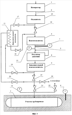 Для повышения эффективности влагоотделения путем охлаждения сжатого воздуха в выходной трубопровод 2 могут быть последовательно установлены между компрессором 1 и влагоотделителем 4 концевой охладитель 10, например регулируемый аппарат воздушного охлаждения (АВО), и дополнительный охладитель 11, включенный по нагревающему потоку воздуха между концевым охладителем 10 и влагоотделителем 4, а по охлаждающему потоку между регулятором 8 и участком 3. Участок 3 снабжен средством 12 измерения давления газа. Для измерения давления нагнетания используется штатное средство компрессора 1. Для повышения точности измерения давления, определяющего влагосодержание воздуха на выходе 5 влагоотделителя 4, на выходе 5 может быть установлено дополнительное средство 13 измерения давления. Оборудование МКУ соединено между собой через запорные краны 14-21, а участок 3 оснащен краном 22 для выпуска воздуха в атмосферу по окончании испытания.