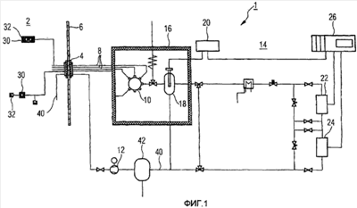 Система 1 взятия проб, показанная на фиг.1, предусмотрена для получения пробы из атмосферы в защитной оболочке 1 реактора неизображенной ядерно-технической установки. Для этого система 1 взятия проб содержит множество входящих в защитную оболочку 2 реактора через проход 4 в ее наружной стенке 6 трубопроводов 8 взятия проб. Они соединены через клапанный блок 10, с помощью которого можно селективно и специально выбирать любой трубопровод 8 взятия проб, с системой 12 пониженного давления и системой 14 анализа. При этом система 14 анализа содержит выполненный с возможностью нагревания по типу термостата наружный корпус 16, в котором дополнительно к клапанному блоку 10 расположен заключенный в кожух газоанализатор 18. Газоанализатор 18, выполненный, например, в виде емкостного датчика, соединен с первым электронным устройством 20 для определения содержания водяного пара, со вторым измерительным местом 22 для определения доли водорода, предпочтительно по принципу теплопроводности, и с третьим измерительным местом 24 для определения доли кислорода. Измерительные места 20, 22, 24 соединены на выходе с центральным электронным блоком 26 оценки, который выполняет также все управление системой и при необходимости сравнение с избыточным сигналом датчика. В неизображенном варианте выполнения охлаждение может отсутствовать, и измерительные места 22 и 24 могут быть расположены также в термостате 16.
