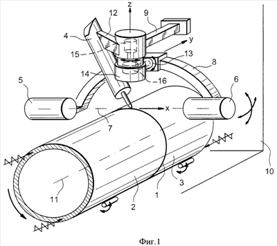 Показанное на фиг.1 устройство предназначено для контроля кругового соединения 1 двух состыкованных труб 2 и 3. Соединение 1 получается при помощи сварки инструментом 4, выполняющим какой-либо сварочный процесс. Устройство контроля, о котором в данном случае идет речь, содержит излучатель 5 света и приемник 6 этого же света, установленные в линию вдоль главной траектории 7 света, по существу касательной по отношению к трубам 2 и 3 и освещающей область соединения 1, в которой работает инструмент 4, и закрепленные на концах изогнутой штанги 8, проходящей над трубами 2 и 3. Штанга 8 установлена на механизме кронштейна 9, закрепленном на сварочной установке 10, детально не показанной на чертеже и содержащей также средства, тоже не показанные на чертеже, для удержания состыкованных труб 2 и 3, позволяющие производить их вращение вокруг оси 11. Инструмент 4 соединен с механизмом кронштейна 9 при помощи жесткого соединительного кронштейна 12, а штанга 8 соединена с механизмом кронштейна 9 при помощи двойного шарнирного соединения, состоящего из первого шарнира 13 с осью у, параллельной оси 11 труб 2 и 3, и второго шарнира 14, ось z которого направлена в сторону стыкового соединения 1. Обе эти шарнирные оси перпендикулярны или практически перпендикулярны к направлению х главной траектории 7 света. Таким образом, вращение вокруг первого шарнира 13 изменяет угол наклона главной траектории 7 относительно соединения 1, а вращение вокруг второго шарнира 14 изменяет угол главной траектории 7 с плоскостью соединения 1. Движения шарниров 13 и 14 управляются двигателями 15 и 16, находящимися внутри них и предназначенными также для их остановки в требуемых положениях. Управление может осуществляться оператором или быть автоматическим, например, если производится сканирование.