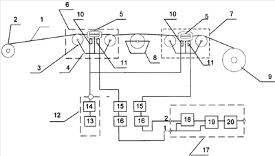 В пропитанной углеродной ленте элементарные жгуты, из которых состоит намоточная лента, обволакиваются слоями связующего, что изолирует их друг от друга. Поэтому в эквивалентной электрической схеме участок пропитанной ленты, расположенный между направляющими валиками второго приемного устройства 7, представляется многовитковой обмоткой, число витков которой пропорционально содержанию связующего в пропитанной ленте. Следовательно, сила тока в цепи участок ленты – направляющие валики 3 – металлическая скоба 4 второго приемного устройства 7 будет существенно больше силы тока в аналогичной цепи первого приемного устройства 6. Поэтому размагничивающий эффект тока возрастает, что приведет к изменению силы F, рассчитываемой по выражению (1) для входа пьезоэлектрического преобразователя 11 второго приемного устройства 7. Так как мерой механической силы F является напряжение на выходе пьезоэлектрического преобразователя, то для формирования информационного сигнала о содержании связующего в пропитанной ленте напряжения с выходов пьезоэлектрических преобразователей 11 первого 6 и второго 7 приемных устройств усиливаются соответственно усилителями высокой частоты 15, детектируются амплитудными детекторами 16 и поступают на входы вычитающего устройства 18 вычислительной схемы 17, на выходе которого формируется напряжение, функционально связанное с количеством связующего в пропитанной ленте. Для формирования процентного состава пропитанной ленты выходное напряжение вычитающего устройства 18 подается на второй вход делительного устройства 19, на первый вход которого поступает напряжение с первого входа вычислительной схемы 17. Выходное напряжение делительного устройства 19 поступает на вход регистрирующего устройства 20.