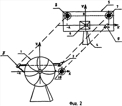 Предлагаемый способ поясняется фиг.2, где 1 – юстируемая антенна, 2, 3 – оптические приборы, 4 – вышка, 5 – щит, 6 – вспомогательная антенна, 7, 8, 10 – геодезические марки, 9 – телекамера.