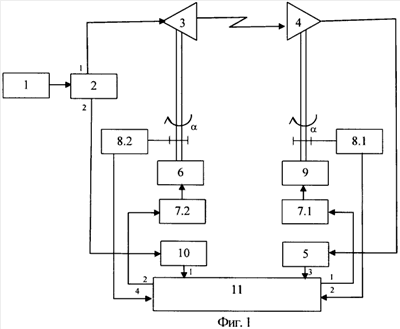 При этом передатчик – 1, направленный ответвитель – 2 (своим первым выходом) и исследуемая антенна – 3 соединены последовательно. Второй выход направленного ответвителя – 2 соединен с входом устройства для измерения мощности сигнала – 10. Выход данного устройства соединен с первым входом устройства обработки и управления – 11. К третьему входу устройства обработки и управления – 11 подключен приемник – 5, ко входу которого подключена приемная антенна – 4. Второй выход устройства обработки и управления – 11 подключен ко входу второго цифроаналогового преобразователя – 7.2, который подключен ко входу устройства вращения исследуемой антенны – 6. Данное устройство механически присоединено к оси вращения исследуемой антенны – 3, также к данной оси вращения механически присоединен датчик угла поворота антенн – 8.2, выход которого подключен к четвертому входу устройства обработки и управления – 11, которое своим первым выходом соединено со входом первого цифроаналогового преобразователя – 7.1, выход которого соединен с входом устройства вращения приемной антенны – 9, которое механически соединено с осью вращения приемной антенны – 4. Также к ее оси вращения механически подключен датчик угла поворота антенн – 8.1, своим выходом присоединенный ко второму входу устройства обработки и управления – 11.