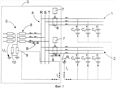 Техническое решение для определения неустойчивого (прерывистого) замыкания на землю основано на переходных процессах заряда и разряда суммарного тока ISUM в фидере и нулевой последовательности напряжения U0 электрической сети. Нулевая последовательность напряжения U0 может быть получена, например, вычислением посредством вычислительного средства 14 среднего значения мгновенных значений напряжений фаз UR, US и UT, измеренных при помощи известных преобразователей напряжения 12 или датчиков напряжения 12. Аналогично, нулевая последовательность напряжения U0 может быть также измерена непосредственно при помощи преобразователя или датчика, измеряющего одновременно напряжение во всех фазах. Суммарный ток ISUM получают соответствующим образом путем вычисления в вычислительном средстве 14′ сумм мгновенных значений фазовых токов IR, IS и IT, измеренных известным образом при помощи преобразователей тока 13 или датчиков тока 13. Аналогично, суммарный ток ISUM может быть также измерен непосредственно при помощи преобразователя тока или датчика тока, измеряющего ток одновременно во всех фазах.