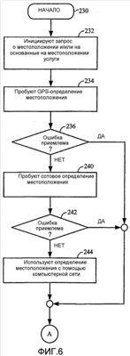Работа системы 100 иллюстрируется на блок-схеме на фиг.6-7. Вначале на этапе 230, проиллюстрированном на фиг.6, MS 102 находится в режиме питания. На этапе 232 MS 102 инициирует запрос информации о местоположении и/или основанных на местоположении услуг. Запрос может быть инициирован вручную пользователем, активирующим устройство 170 ввода (см. фиг.2). Альтернативно запрос может быть инициирован автоматически. Например, запрос может периодически передаваться без необходимости вмешательства пользователя.