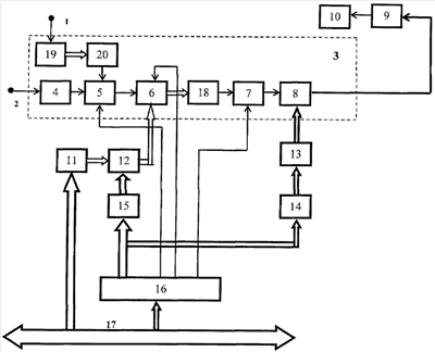 На чертеже приведена функциональная схема радиолокационного имитатора цели, где: 1 – вход импульсной модуляции; 2 – вход СВЧ; 3 – модуль СВЧ; 4 – устройство автоматической регулировки мощности; 5 – импульсный модулятор; 6 – группа амплитудных модуляторов; 7 – переключатель уровня мощности; 8 – цифровой аттенюатор; 9 – линия связи; 10 – рупорная антенна; 11 – группа синтезаторов доплеровских частот; 12 – группа умножающих ЦАП; 13 – группа ключей; 14 – первое ППЗУ; 15 – второе ППЗУ; 16 – интерфейс мультиплексной шины; 17 – мультиплексная шина управления; 18 – СВЧ сумматор; 19 – многоотводная линия задержки; 20 – сумматор.