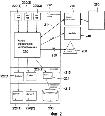 На фиг. 2 представлена блок-схема архитектуры для услуги 210 обеспечения информированности о местоположении. Как показано, услуга 210 определения местоположения может представлять собой услугу 212 пользовательского режима и может устанавливаться на компьютере, таком как компьютер 110, или на портативном вычислительном устройстве. Услуга 212 определения местоположения принимает данные от множества приложений 220(1-3) и извне устройства/компьютера, как показано позицией 214. Услуга 210 определения местоположения связана в устройстве с компонентом 215 режима ядра (привилегированного режима), таким как драйверы 222(1-2) и компонентом 224 файловой системы Windows®. Драйверы 222(1-2) и компоненты 224 файловой системы Windows® показаны как связанные с аппаратными средствами 216. Каждый драйвер 222(1-2) показан связанным с соответствующим ему устройством 226(1-2) аппаратных средств. Компонент 224 файловой системы Windows® показан связанным с устройством 230 памяти, которое может представлять собой базу данных для хранения данных файловой системы Windows®. Услуга 210 определения местоположения может быть также связана с приложением MapPoint® или иным приложением, конфигурированным для запроса информации местоположения и совместимым с вариантами осуществления или устройством 240 для обеспечения данных местоположения. Услуга 210 определения местоположения также связана с активным каталогом 260 через облегченный протокол службы каталогов (LDAP) 250. Услуга 210 определения местоположения также может быть связана с внешним устройством/клиентом 280, которое может быть связано с сервером 270 присутствия через коммуникационный канал 214. Более конкретно, услуга 210 определения местоположения может обеспечить информацию местоположения, которая может быть извлечена, например, клиентом услуги RTC (связи в реальном времени). Клиент услуги RTC может затем передать информацию к серверу 270 присутствия.
