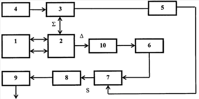 На чертеже приведена структурная схема устройства, где: 1 – антенна; 2 – формирователь суммарного и разностного сигналов; 3 – переключатель «прием-передача»; 4 – передатчик; 5, 6 – амплитудный детектор; 7 – вычитатель; 8 – видеоусилитель; 9 – ограничитель; 10 – управляемый аттенюатор.
