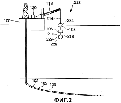 Однако система управления источником согласно одному объекту изобретения, показанная на фиг.2, способствует получению намного более точных сейсмических данных. В соответствии с компоновкой из фиг.2 также имеется морская буровая установка (100), расположенная над подводной буровой скважиной (102), содержащей множество приемников (103). Буровая установка (100) показана несущей систему управления источником, в целом обозначенную как (222). В соответствии с некоторыми вариантами осуществления буровая установка (100) может быть заменена подвижным судном. Система (222) управления источником включает в себя сейсмический источник, грузоподъемное устройство, шлангокабель (214) и находящийся в море контроллер (218) источника, предназначенный для управления запуском сейсмического источника. Система (222) управления источником и скважинные приемники (103) могут быть объединены для образования скважинной исследовательской системы.