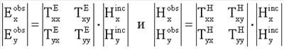 где Т представляют собой инвариантные передаточные функции, которые зависят только от геологической модели. Составляющие Hxi не должны измеряться в то же самое время, что и составляющие Hyi. Инверсия этого набора данных может потребовать нахождения распределения проводимости, которое дает значения THE, которые обеспечивают наилучшую аппроксимацию к данным.