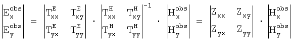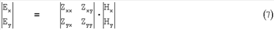 Поверхностный импеданс Z, как показано в уравнении (2), представляет собой инвариантную функцию, определенную свойствами подповерхностных пластов. Вообще говоря, поверхностный импеданс Z представляет собой тензор, который соотносит горизонтальные ортогональные составляющие электрического поля E с теми же составляющими магнитного поля H: