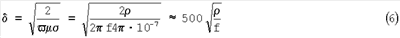 Уравнение (6) показывает, что глубина исследования зависит от частоты f – более низкие частоты дают большие глубины проникновения поля, а более высокие частоты дают меньшие глубины проникновения поля. Доступный спектр естественных полей имеет частоты в пределах от 10-4 Гц до 104 Гц. Указанные естественные поля могут давать глубины исследования от нескольких десятков метров до нескольких десятков километров в типичных геологических пластах. В слоистом полупространстве удельное сопротивление, полученное с использованием вышеприведенной формулы для А (см. уравнение (3)), приблизительно равно среднему удельному сопротивлению слоев до глубины проникновения поля.