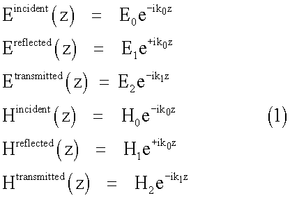 где и i – запись для комплексного числа=квадратному корню из (-1), – частота, измеряемая в радиан/сек, – удельная электропроводность в сименс/м, µ – магнитная проницаемость, – диэлектрическая проницаемость свободного пространства и z – поверхностный импеданс; Eincident, Нincident – составляющие падающего электрического и магнитного поля, соответственно; Ereflected, Нreflected – составляющие отраженного электрического и магнитного поля, соответственно; Еtransmitted, Нtransmitted – составляющие прошедшего электрического и магнитного поля, соответственно.