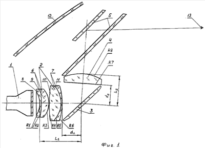 R1, R2 и коэффициентом преломления n1, и положительного мениска 9 со значениями радиусов первой и второй поверхностей R2, R3 и коэффициентом преломления n2. Вторая положительная линза 7 склеена из положительной линзы 10 со значениями радиусов первой и второй поверхностей R4, R5 и коэффициентом преломления n3 и отрицательного мениска 11 со значениями радиусов первой и второй поверхностей R5, R6 и коэффициентом преломления n4. Второй компонент 4 объектива представляет собой положительную плосковыпуклую линзу со значениями радиусов первой и второй поверхностей R7= , R8 и коэффициентом преломления n5. Выпуклая поверхность R8 выполнена параболической. Длина воздушного промежутка объектива d равна сумме d1 и d2, где d1 расстояние от поверхности с радиусом R6 первого компонента до вертикальной оси, a d2 расстояние от поверхности с радиусом