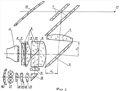 Двухкомпонентное полупрозрачное наклонное зеркало 5, расположено над объективом между лобовым стеклом 19 и глазом пилота 20.