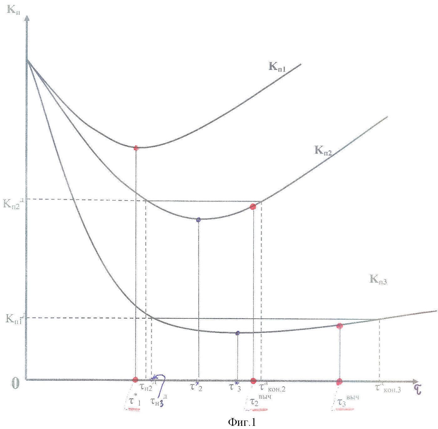На фиг.1 в качестве примера показаны результаты исследования зависимости Кп( ) для трех разнонадежных средств и дана графическая интерпретация результатов реализации соотношения (7).